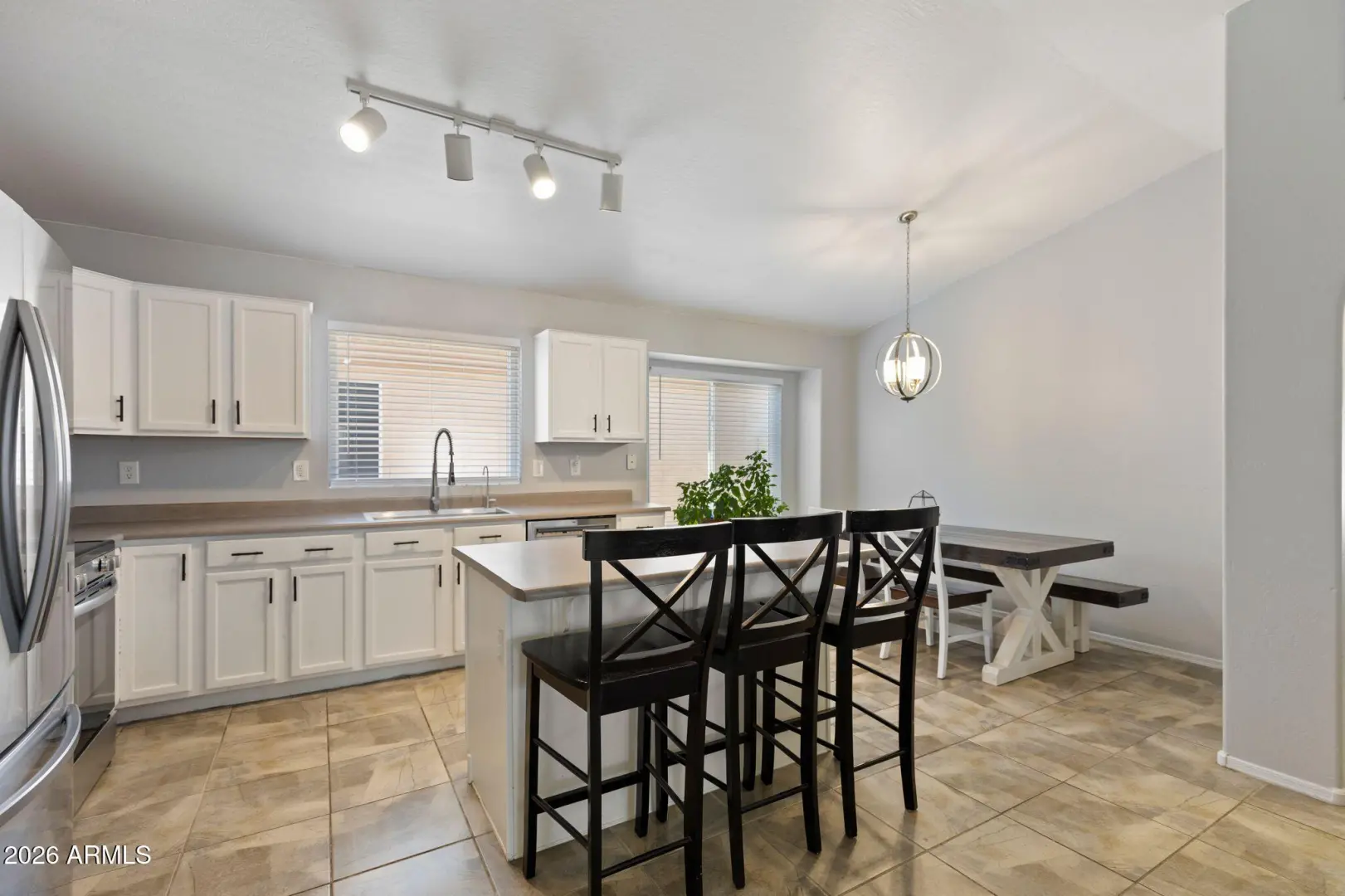 This one truly checks all the boxes. Situated on a desirable corner lot backing to open green space and a park, this beautifully maintained 3-bedroom, 2-bath home plus office/den offers privacy, functionality, and modern updates throughout. The open-concept layout is highlighted by vaulted ceilings, a breakfast bar, white painted cabinetry, stainless steel appliances (new in 2024), and a welcoming dining area perfect for everyday living or entertaining. Major updates include all new windows and a water softener with RO system in 2023, plus a new water heater in 2024. The spacious primary suite features fresh paint, a walk-in closet, and a private ensuite bath complete with dual vanities topped with quartz counters, a tiled shower with glass door (new in 2021), and a separate toilet